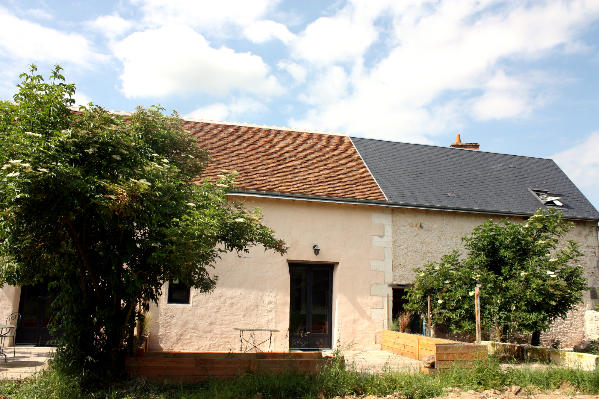 Côté cour, le cerisier à fleurs et le tilleul invitent à la détente ; côté champs, les terrasses font suite à un grand espace bordé de cerisiers et de pruniers.